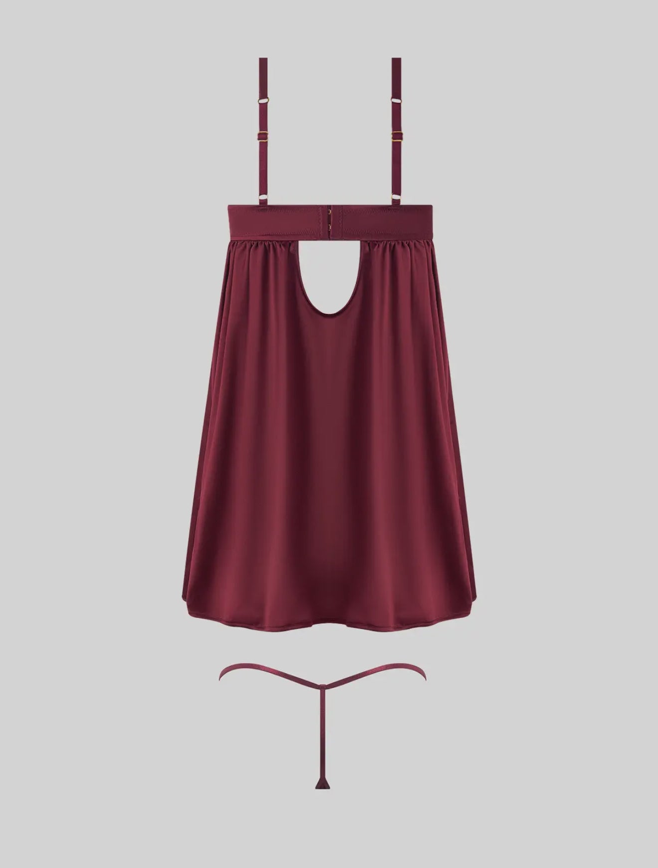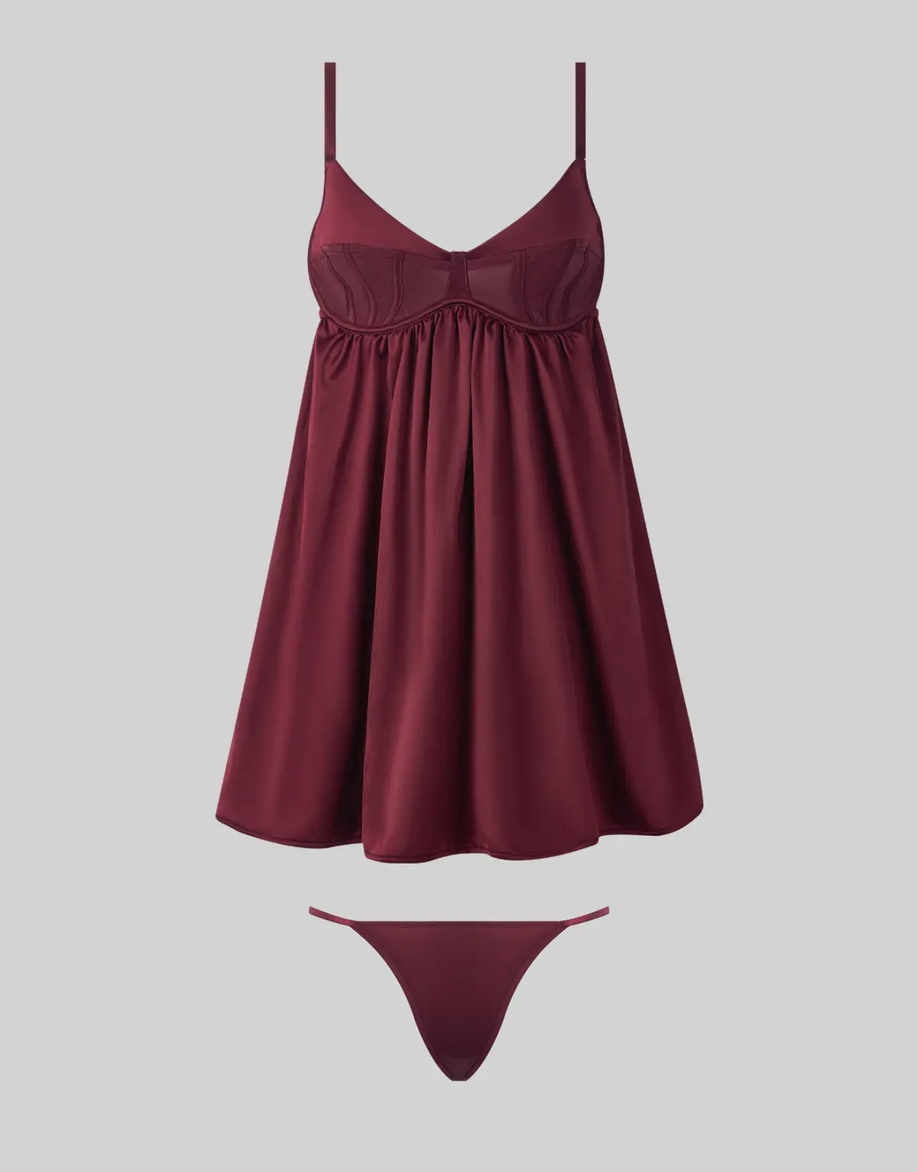Crafted in luxe satin and breathable mesh. - Sheer demi cups with caged design. - Adjustable shoulder straps and hook and back closure. - Flowing babydoll design for a delicate fit. - Sheer mesh front g-string panty with barely-there straps. Care & Content: - 97% POLYESTER, 3% SPANDEX. EXCLUSIVE OF TRIMS AND ELASTIC. - HAND WASH COLD WATER. NON-CHLORINE BLEACH. HANG TO DRY. DO NOT IRON.